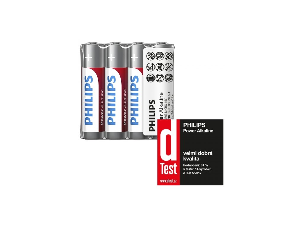 Čtyři kusy baterie typu PowerLife AAA (1,5V), řada Power Alkaline. alkalické baterie jsou 6x lepší než průměrné zinkouhlíkové baterie. Skladovatelnost až 5 let. Baterie Philips zaručeně neobsahují žádné škodlivé těžké kovy, jako je kadmium, rtuť a olovo, balení ve fólii.