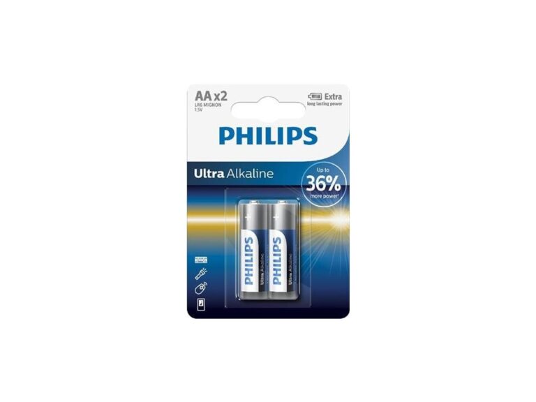 Dva kusy baterií typu AA (1,5V), řady Ultra Alkaline. Poskytují o 30% více energie než obyčejné alkalické baterie. Tyto alkalické baterie jsou 6x lepší než průměrné zinkouhlíkové baterie. Skladovatelnost až 5 let. Baterie Philips neobsahují žádné škodlivé těžké kovy, jako je kadmium, rtuť a olovo.