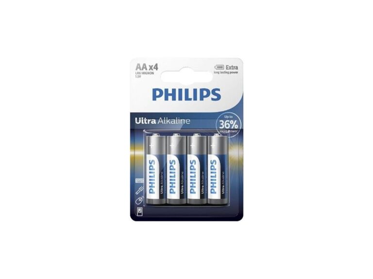Čtyři kusy baterií typu AA (1,5V), řady Ultra Alkaline. Poskytují o 30% více energie než obyčejné alkalické baterie. Tyto alkalické baterie jsou 6x lepší než průměrné zinkouhlíkové baterie. Skladovatelnost až 5 let. Bterie Philips zaručeně neobsahují žádné škodlivé těžké kovy, jako je kadmium, rtuť a olovo.